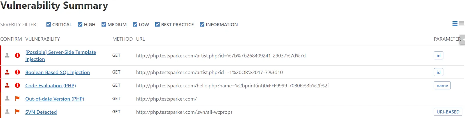 Reports list the severity level of each detected vulnerability along with its impact if exploited. They use Invicti’s unique Proof-Based Scanning technology to demonstrate how it was possible to exploit the vulnerability in a safe and read-only manner. Remediation information is supplied, including direct actions to take.
