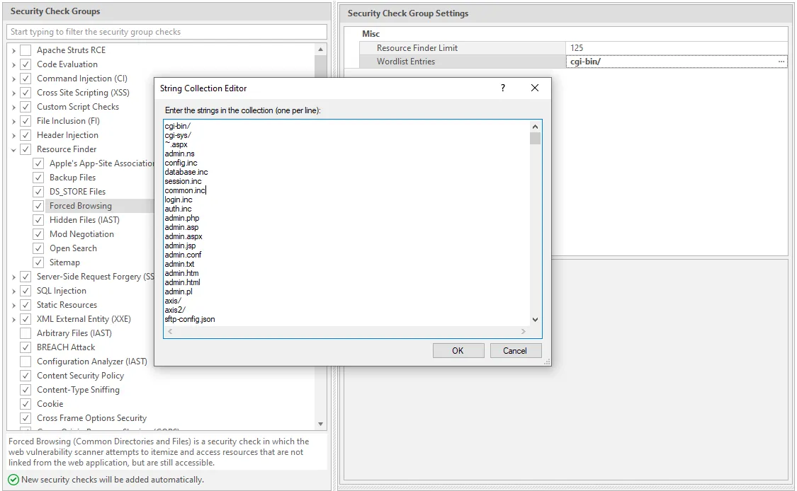 Netsparker Standard now features an improved directories security check. Formerly known as Common Directories, Forced Browsing in Netsparker Standard allows you to edit the Wordlist Entries in the program.Previously, you could find this word list in the C:\Users\[Username]\Documents\Netsparker\Resources\Configuration\Folders.txt file.Netsparker used this file to access additional links and find more vulnerabilities. If resources such as backup files and admin portals are discovered, they could assist an attacker to craft an attack against your website.