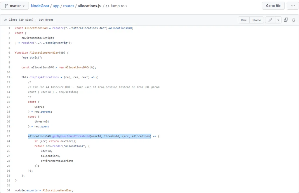 In the source code of the NodeGoat application, this vulnerability is introduced in the allocations-dao.js file referenced by allocations.js in the app/routes folder. Let’s go through the process of isolating this specific file based on the vulnerability report.