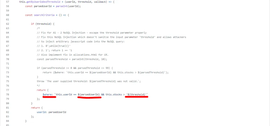 All injection attacks are made possible by unsanitized inputs, so this is where all remediation should start. Since the NodeGoat application was created by OWASP for educational purposes, it already includes a remediation method. Looking at the allocations-dao.js file in the screenshot below, you can see the fix suggested in the comment (in blue):