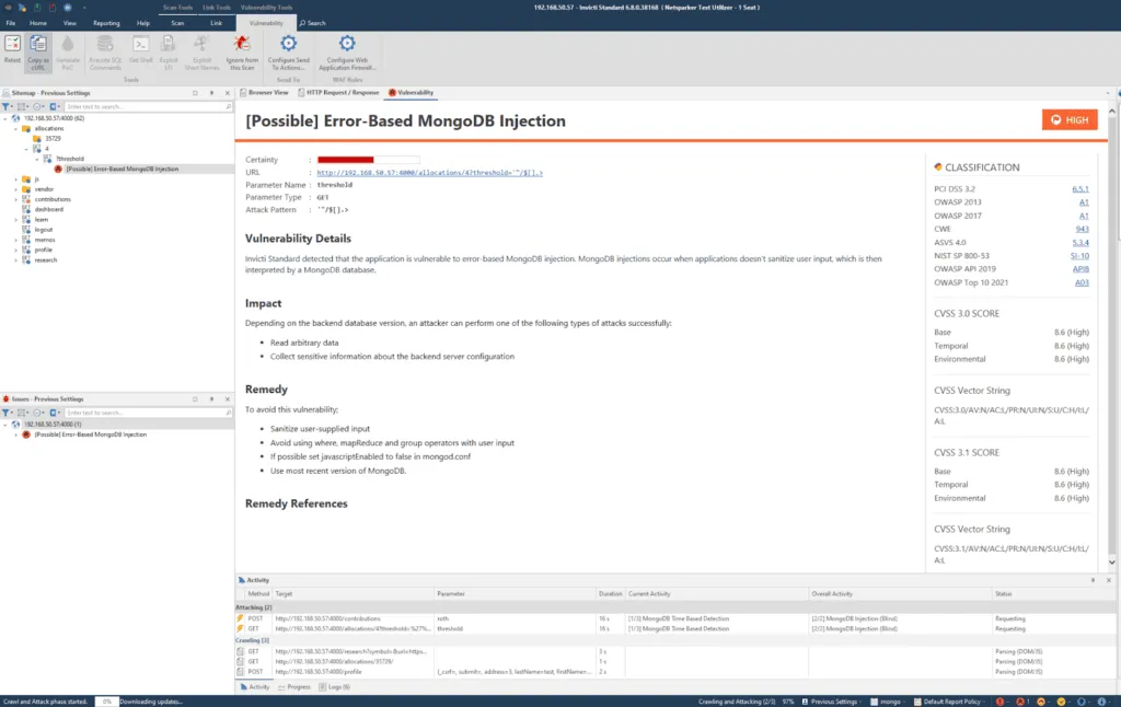 After scanning the application with Invicti, we now know that the Allocations page is vulnerable to NoSQL injections into the threshold