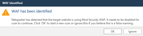 At that point, you can do one of two things. You can either stop the scan and disable the WAF, then start a new scan. Or, you can simply dismiss the warning.For further information, see Security Checks and WAF Identifier Security Check. For further information on other features in the latest release, see Netsparker Standard 5.6 – January 2019 Update.