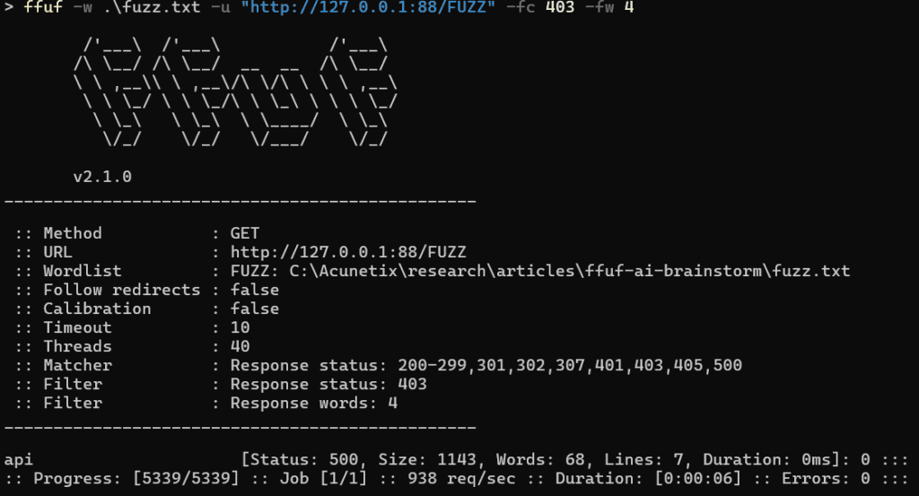 Now, let's use the new tool, brainstorm. It is designed to receive a full ffuf command line as a command line argument, so you can run ffuf first, exclude some responses, and then pass the full command line to brainstorm.