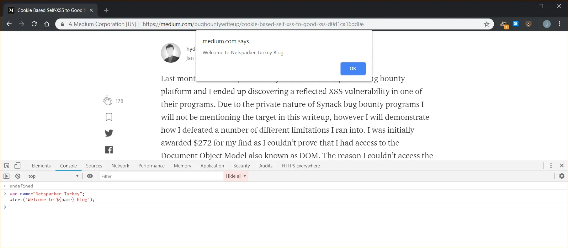 Hyde also discovered a Self-XSS vulnerability on a subdomain within the scope of the Bug Bounty website with a bug bounty program. Exploiting a Self-XSS is extremely difficult, as it requires an injection using a cookie value. Changing the value of a cookie on a user’s browser, without the assistance of another vulnerability, is not possible.