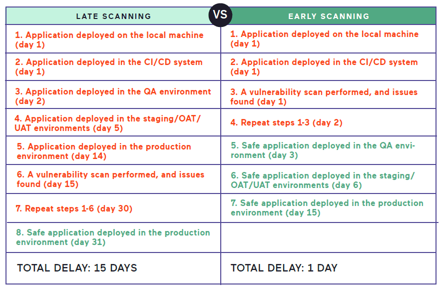 There are many advantages to finding vulnerabilities at such an early stage. First of all, if a vulnerability is found at any later stage, it must go back to the developer, and the build process must be repeated. Therefore, it consumes unnecessary resources and delays the release. In the worst possible case, if a vulnerability is found on a production system, it may even require the release to be reverted and delay the re-release by several days or weeks (depending on the deployment procedures and resource availability).