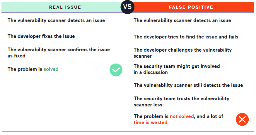 In smaller organizations with few assets and few vulnerabilities, the false positive rate is often not a significant problem because the total number of false positives is relatively small. However, in a large organization with thousands of assets, even a seemingly negligible positive rate may mean several false alarms appearing in every sprint. This, in turn, causes the security and development teams to lose trust in the vulnerability scanner. It can cause issues to be treated less seriously, or it may ultimately lead the organization to stop vulnerability scanning altogether due to the associated cost.