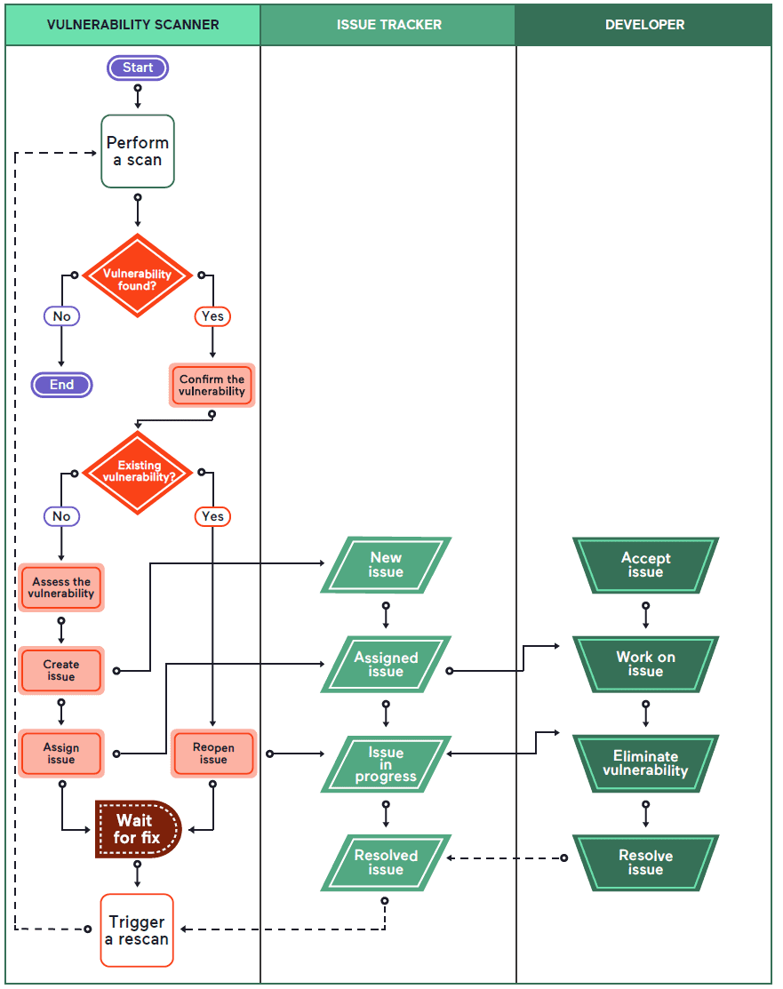 Some parts of the above process may be automated, but some will remain manual. A large organization will want to automate as much as possible, and therefore the only steps that should remain manual are those associated with fixing the vulnerability. In an agile environment, the product/service owner or team leader will have to oversee the issue management process, for example, manually allocate the vulnerability to a sprint and reassign it to a particular developer.