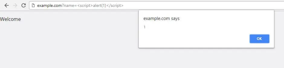 By passing the following HTML and JavaScript code to the name parameter, the application will embed it unfiltered on the page, which will display a JavaScript alert window on the vulnerable website.